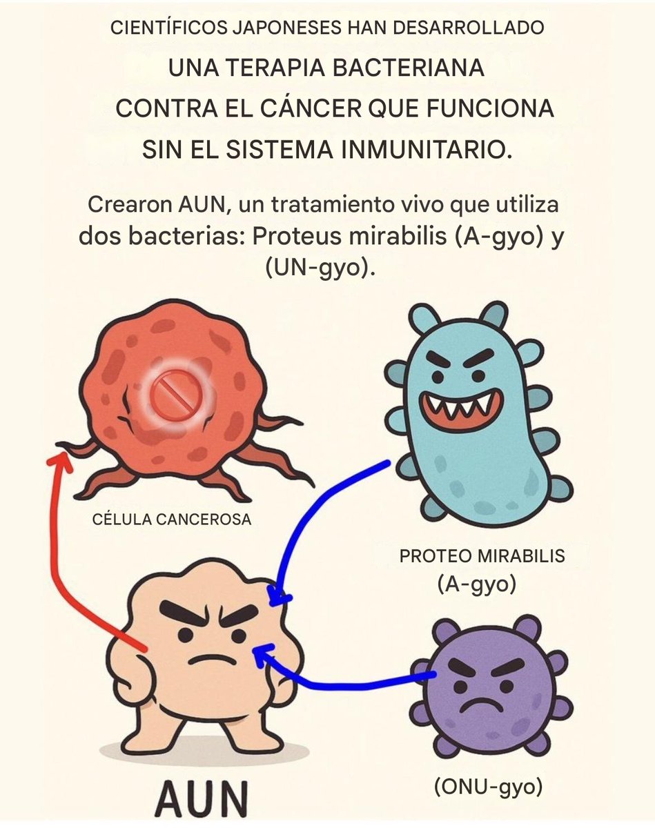 Cómo funciona: dos bacterias que ya existen en la naturaleza, Proteus mirabilis y Rhodopseudomonas palustris, trabajando a la par como un mini equipo quirúrgico que se adapta dentro del tumor y lo desmantela célula a célula.