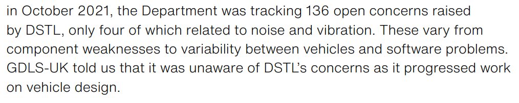 (15/n) The big ticket noise and vibration remains unresolved. There are "mitigations" (unspecified, some claim it is very simple, but that doesn't marry with the pace of resolution under such public scrutiny). Interesting is the note of 136 dstl concerns, 132 are not N&V related