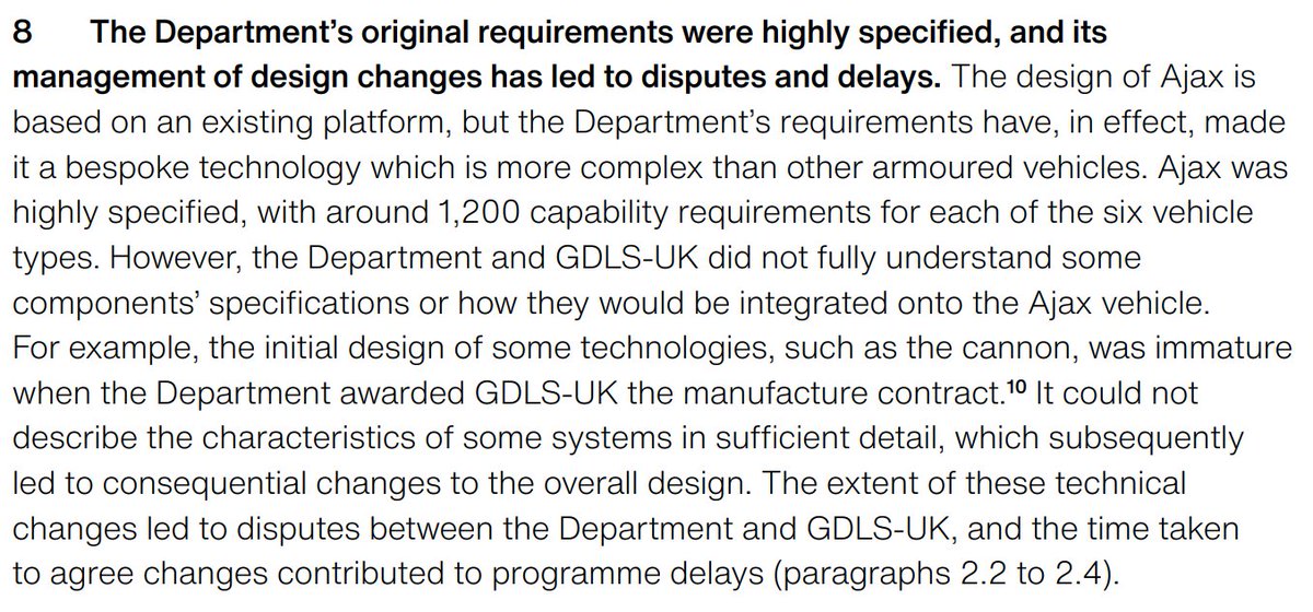 (9/n) Its been said for years, but MoD massively overcomplicate requirements and Ajax is a pinnacle of it. 1,200 requirements which neither the MoD nor GDLS understand, nor their interactions. The US had a similar issue which is what led to their novel approach on OMFV...