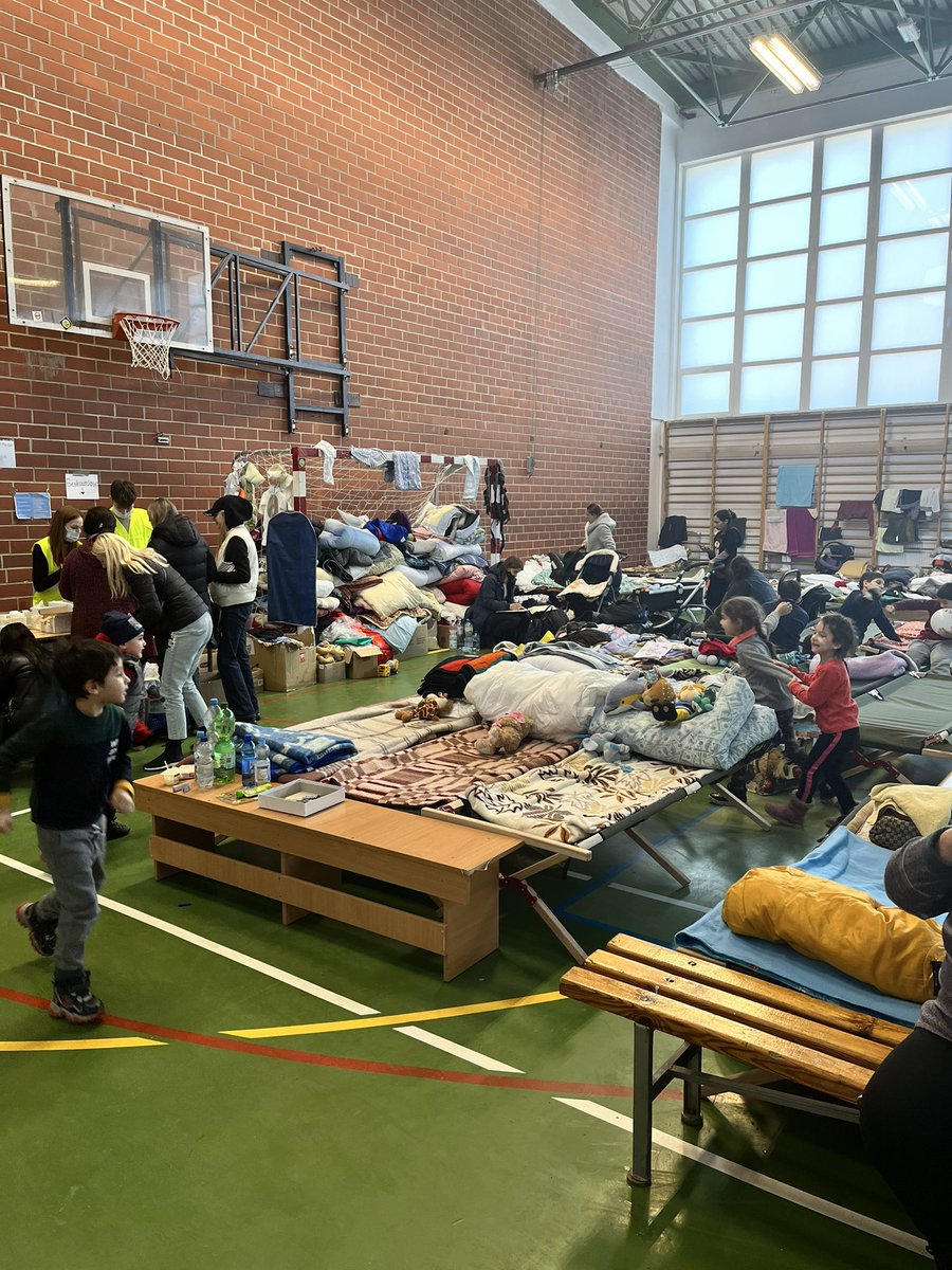 Eastern Poland’s transformation into one huge refugee corridor continues. Normally this gym is part of a technical college in Zamość, about an hour from Lublin. As it is this section of the building has been sectioned off completely to become a rest centre.