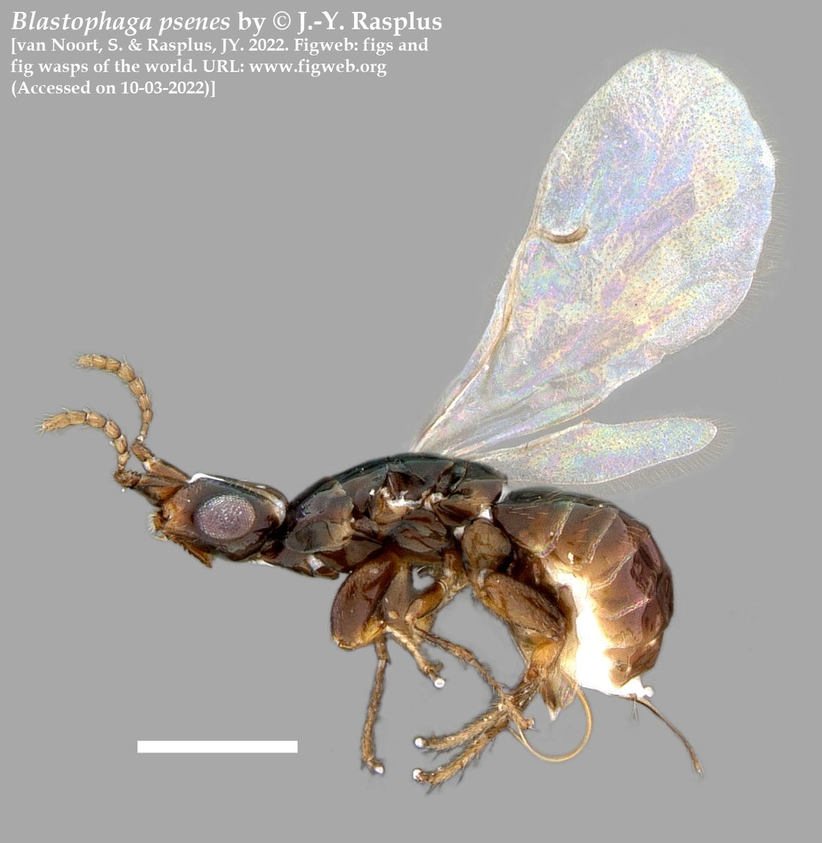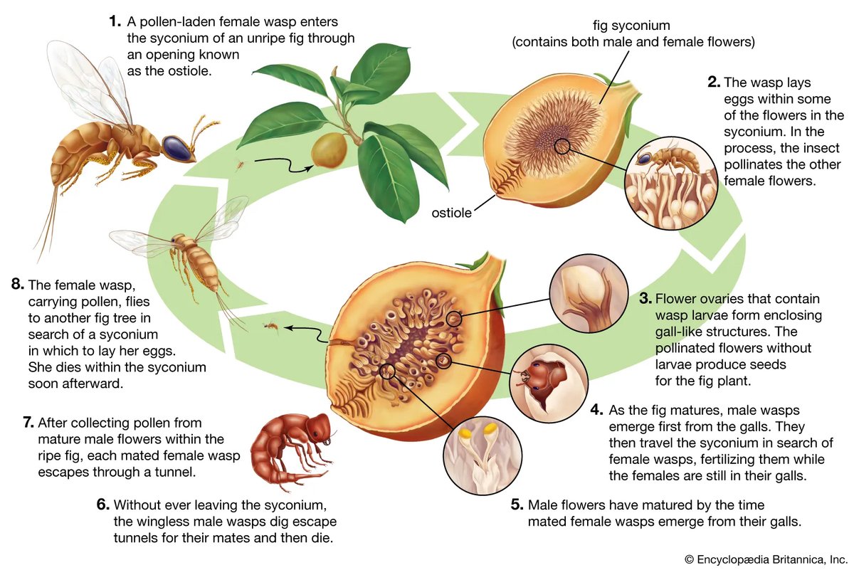 Dentro de esta familia, sólo las 🐝 de las subfamilias Agaoninae, Kradibiinae y Tetrapusiinae son polinizadoras de Ficus. En el caso de la higuera, quien poliniza es la ♀️ de Blastophaga psenes (Agaoninae) 👇. Cada especie de Ficus es polinizada por 1 o 2 especies de avispa.