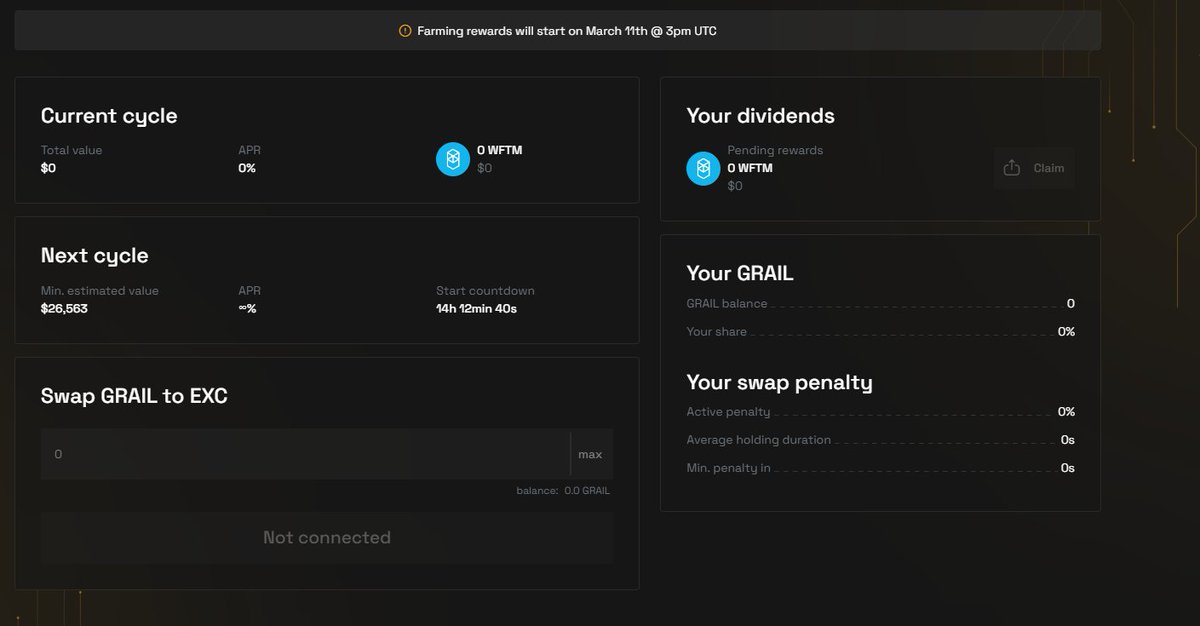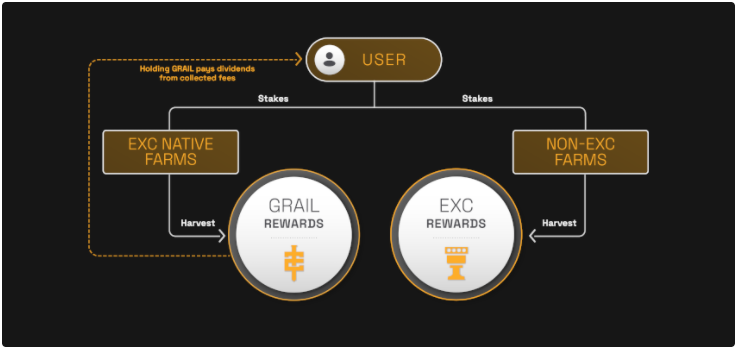 If you don’t want $Grail you can immediately swap 1:1 for $EXC (with a 30% penalty) or hold for a period time until it vests for no penalty. Or you can stake in Dividends immediately to start earning your share of the protocol fees.