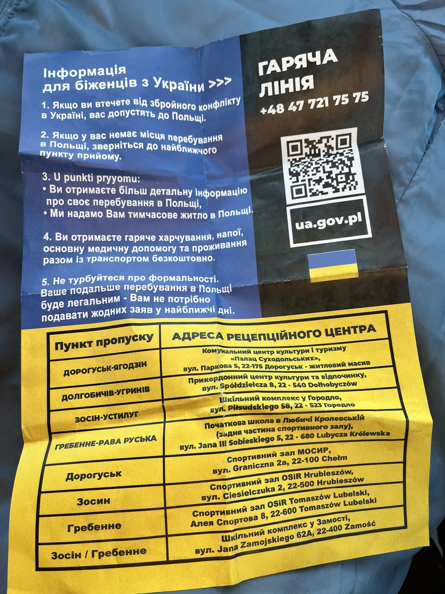 This leaflet is given out by the authorities at Zosin crossing to 🇺🇦 arrivals: “You will receive a hot meal, drink and accommodation…don’t worry about the formalities. Your further stay in Poland will be legal. You don’t have to submit any applications in the coming days.”