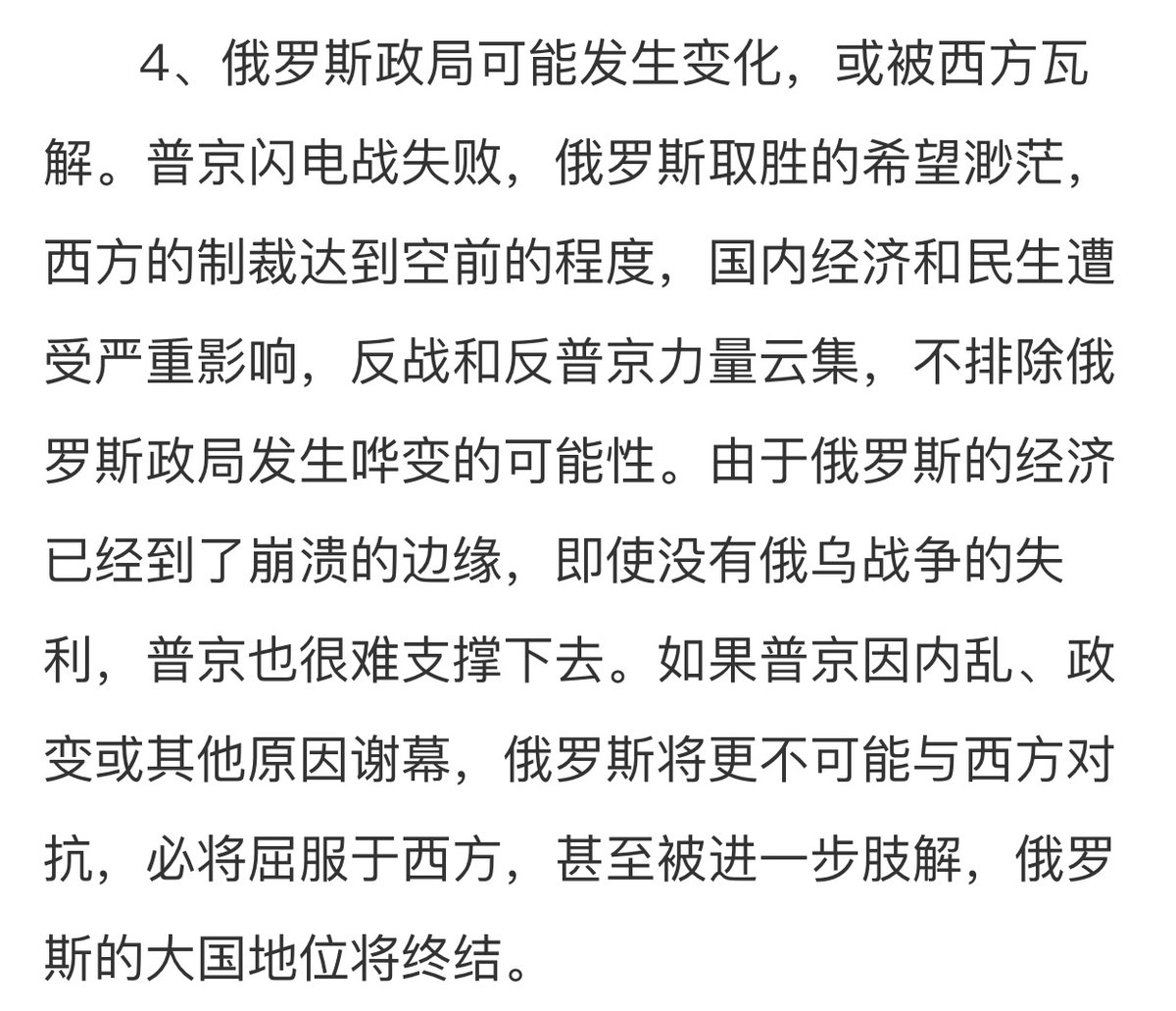 Anti-war forces and anti-Putin forces will likely overthrow Putin and Russia may even disintegrate further and no longer be a great power….