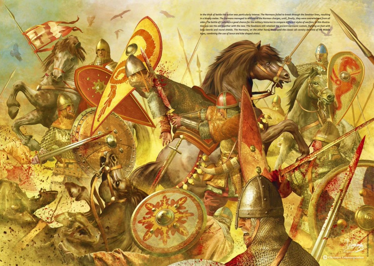 Norman chornicler William of Apulia writes about this curious group of German mercenaries who arrived to fight the Normans. He described them as infantrymen who were not well versed with cavalry, but excelled with swords! He saw them as dangerous enemies on the battlefield!
