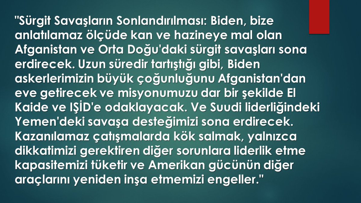 ABD, Ortadoğu’daki yeni enerji planını uygulayabilmesi için bölgede güçlü müttefiklere ihtiyaç duyuyor. Türkiye ve İsrail gibi. Bu nedenle öncelikle 'sürgit savaşların sonlandırılması' gerekiyordu. Biden seçim ekibinin açıkladığı politikaya bakalım: