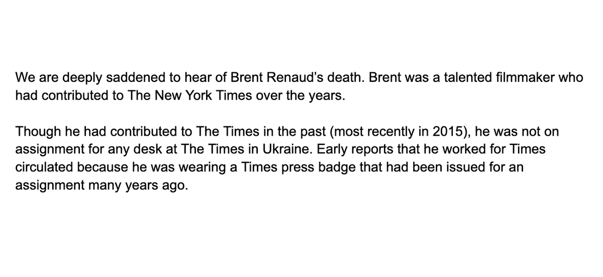UNCONFIRMED. An employee of the American newspaper New York Times was killed in Irpin. Another American was wounded.