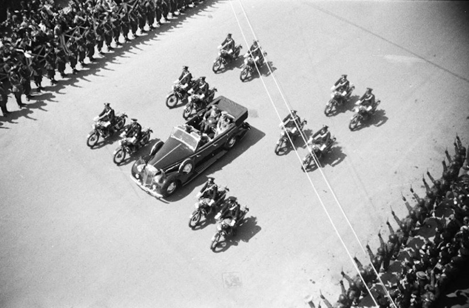 Ad un tratto l’auto scoperta avanzò tra le due ali di folla e lui, il Fuhrer, si alzò in piedi.
