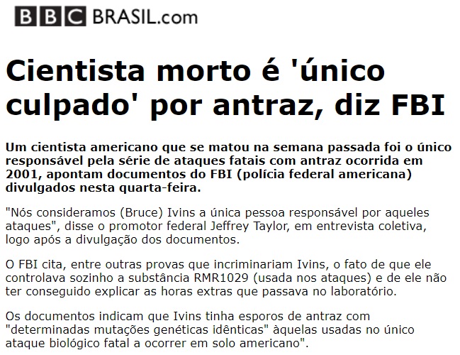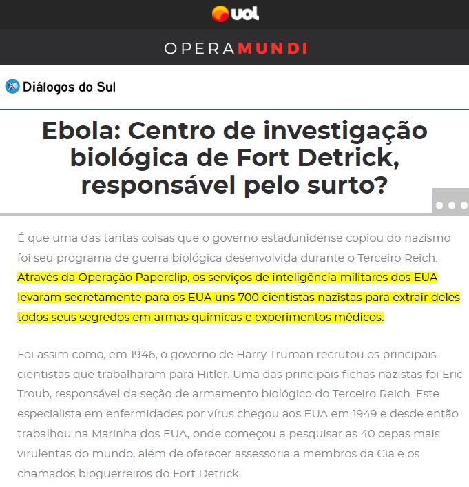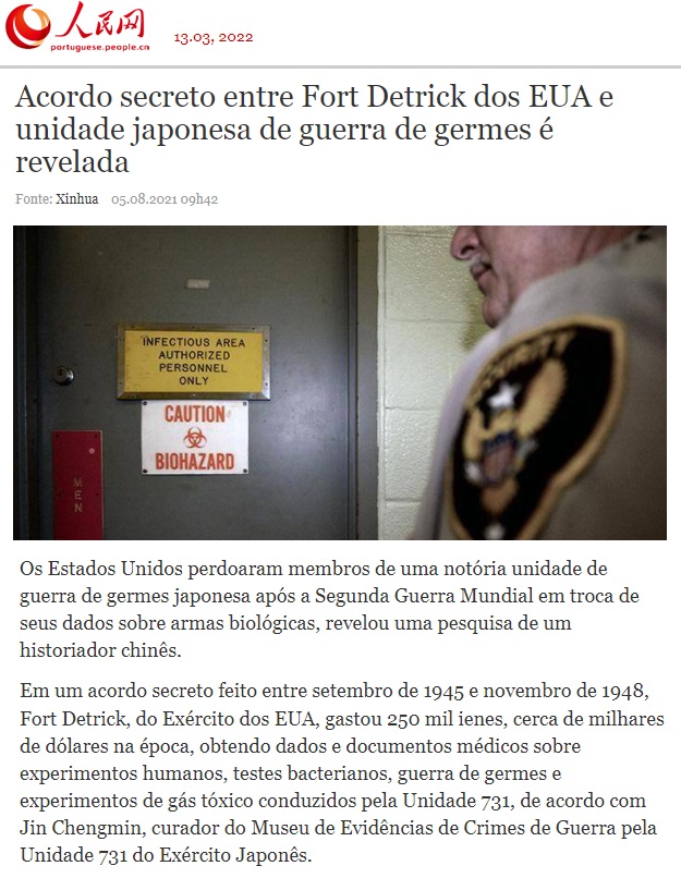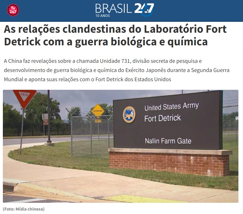 "As relações clandestinas do Laboratório Fort Detrick com a guerra biológica e química". Artigo da Rádio Internacional da China, republicado pelo Brasil 247: