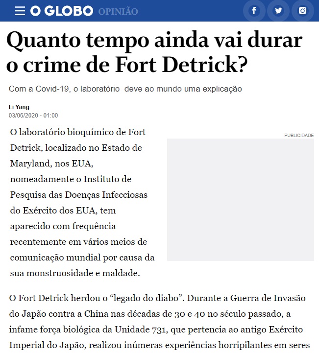 "Opinião: mistério de Fort Detrick poderá ter as respostas para a origem do coronavírus". Artigo de Por Niu Wenxin no China News Weekly, republicado pelo portal Portuguese People: