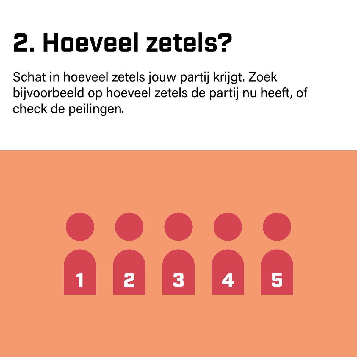 Schat in hoeveel zetels jouw partij ongeveer krijgt. Zoek bijvoorbeeld op hoeveel zetels de partij nu heeft, of zoek (in grote gemeenten) naar peilingen. 🪑🪑🪑