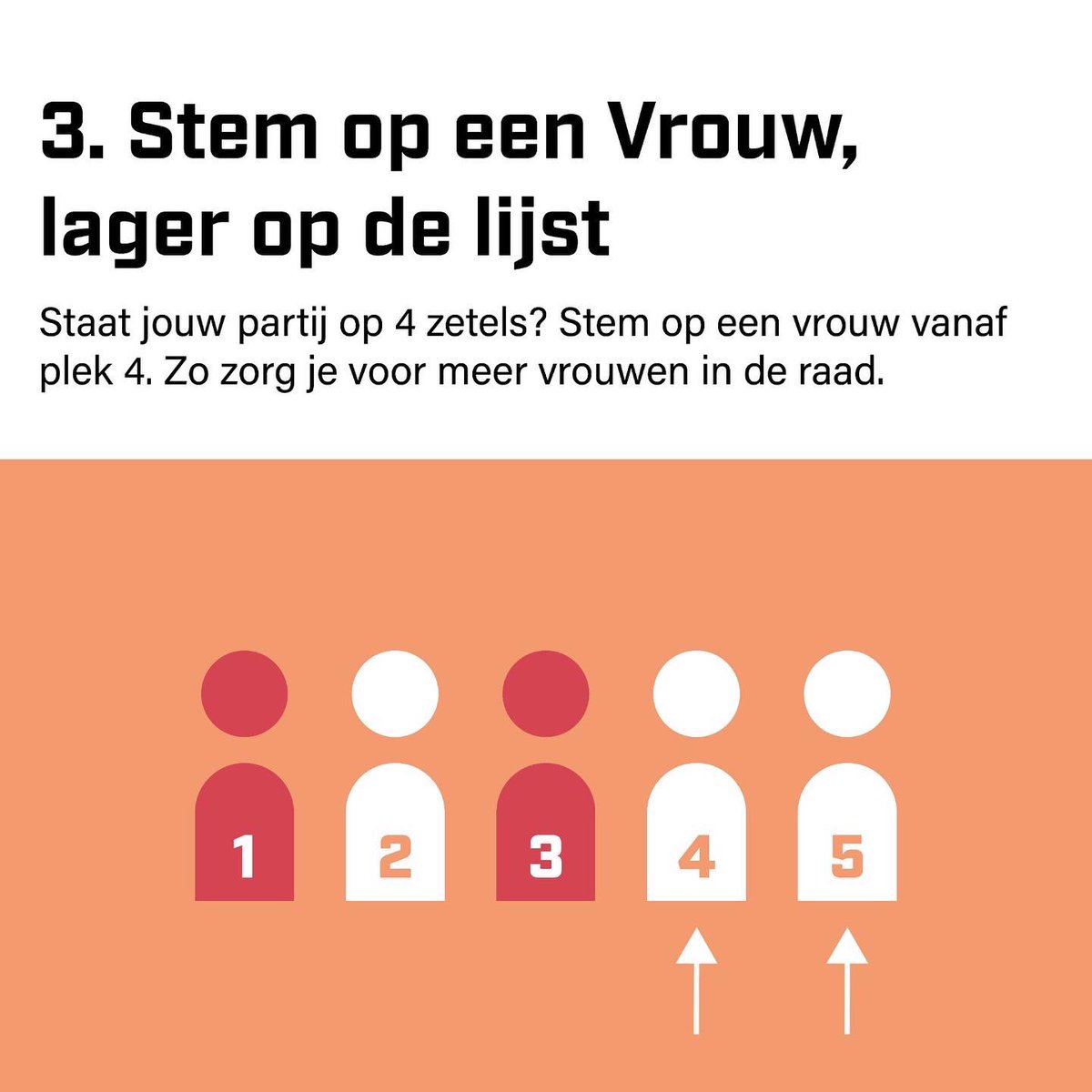 Waarom? Vaak redt de eerste vrouw op de lijst het sowieso, dankzij haar hoge positie! Denk je bijv. dat jouw partij 4 zetels haalt? Stem op een vrouw vanaf plek 4, en kies uiteraard iemand die bij je past. Zo verkies je extra vrouwen!