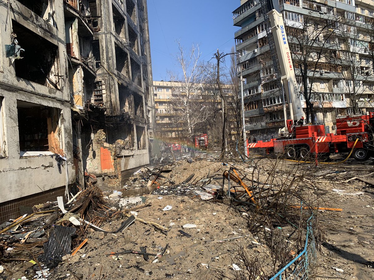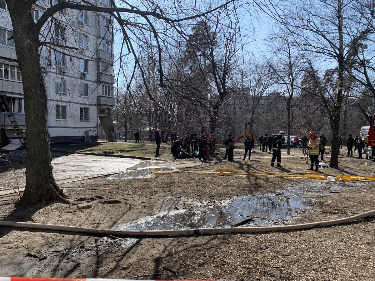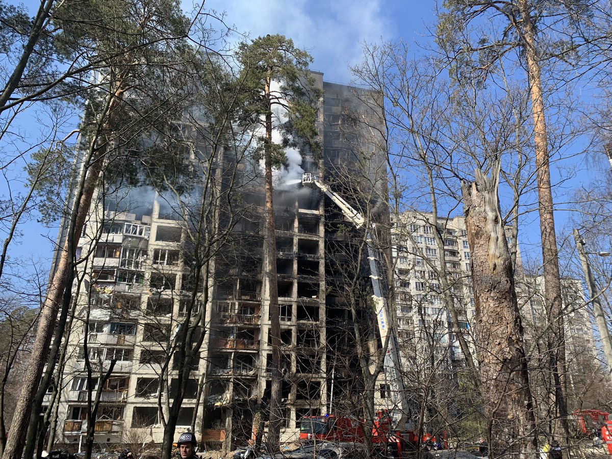 Another residential building was shelled in Kyiv this morning, I am here now in Svyatoshyns'kyi District where first responders are still tackling the flames that have totally gutted this apartment block