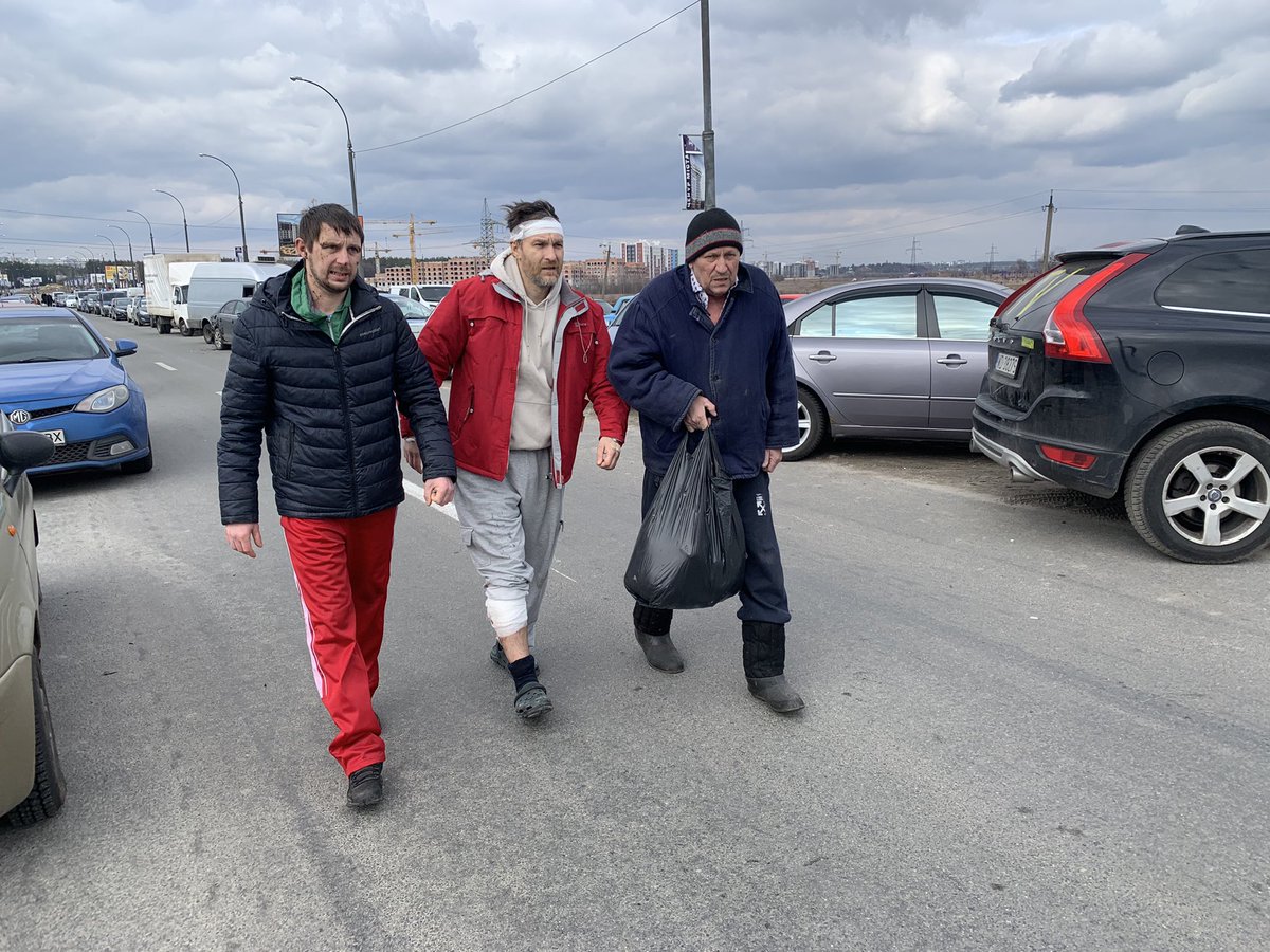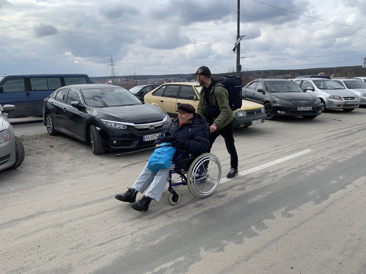 Civilians make their way across the destroyed bridge in Irpin assisted by Ukrainian soldiers and Territorial Defence Volunteers. A few brave drivers are driving back into the fighting to shuttle IDPs to safety