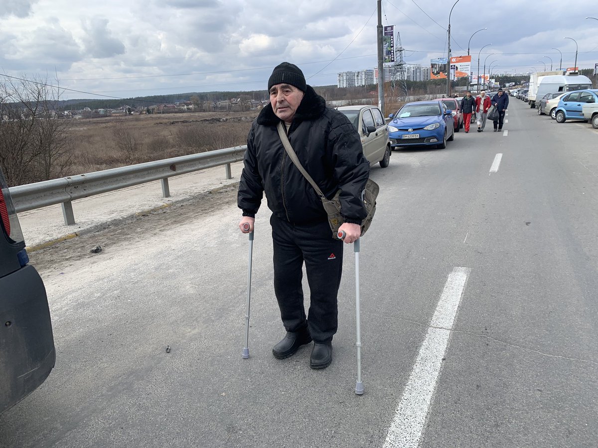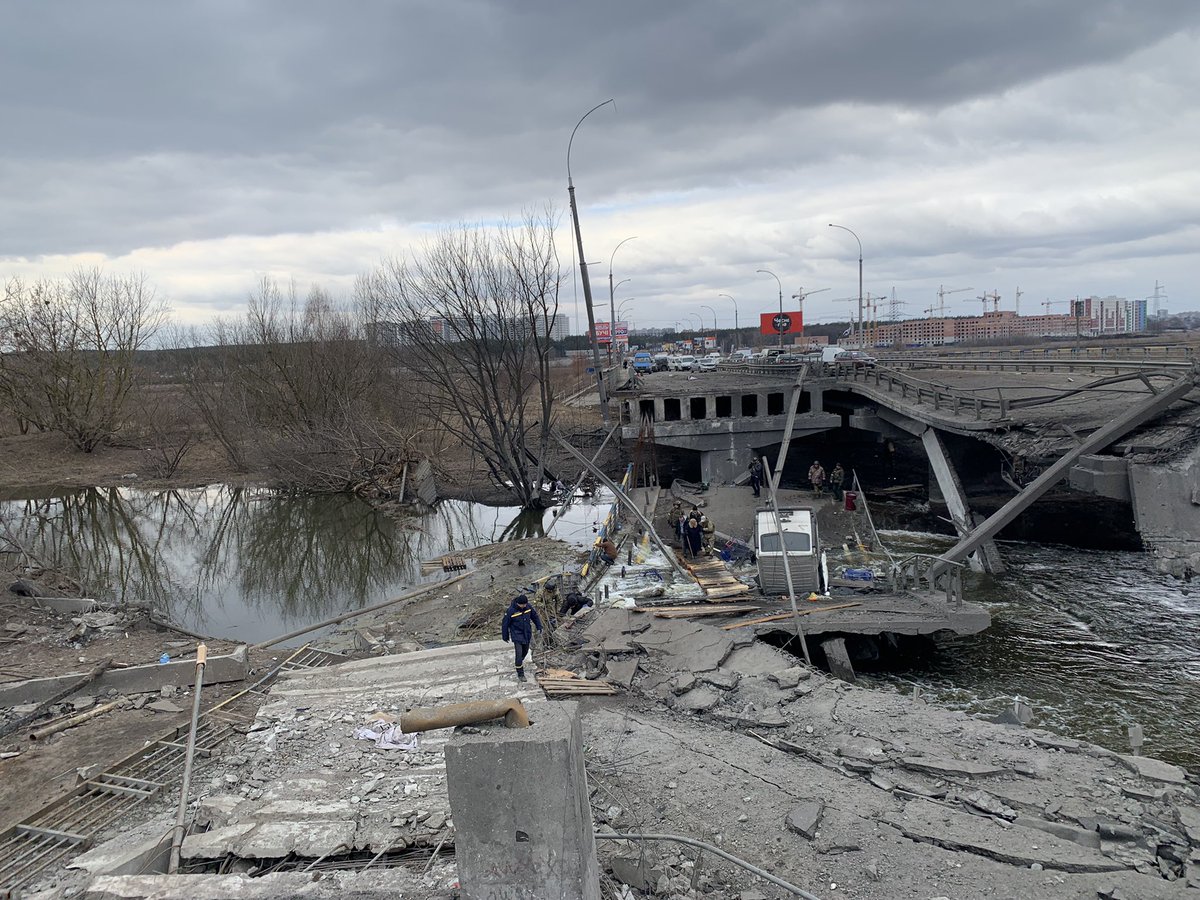 Devastation surrounds us in Irpin, just northwest of Kyiv, the scene of heavy fighting this morning as civilians continue to flee across the river on foot