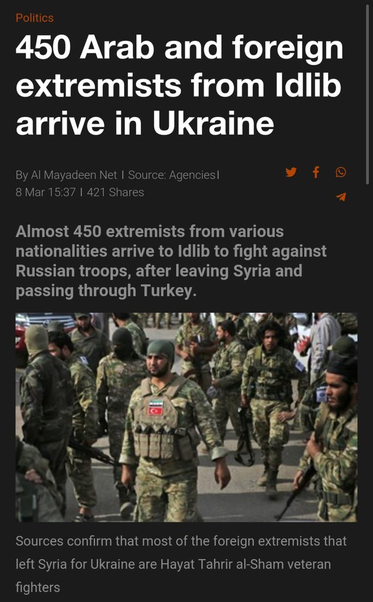 Baru-baru ini, Al Mayadeen memberitakan bahwa ada sekitar 450 ekstremis Arab dan warga negara asing telah tiba di Ukraina dari Idlib untuk berperang melawan pasukan Rusia di Ukraina. Melewati Turki, konon mereka butuh waktu tiga hari sejak meninggalkan Suriah.