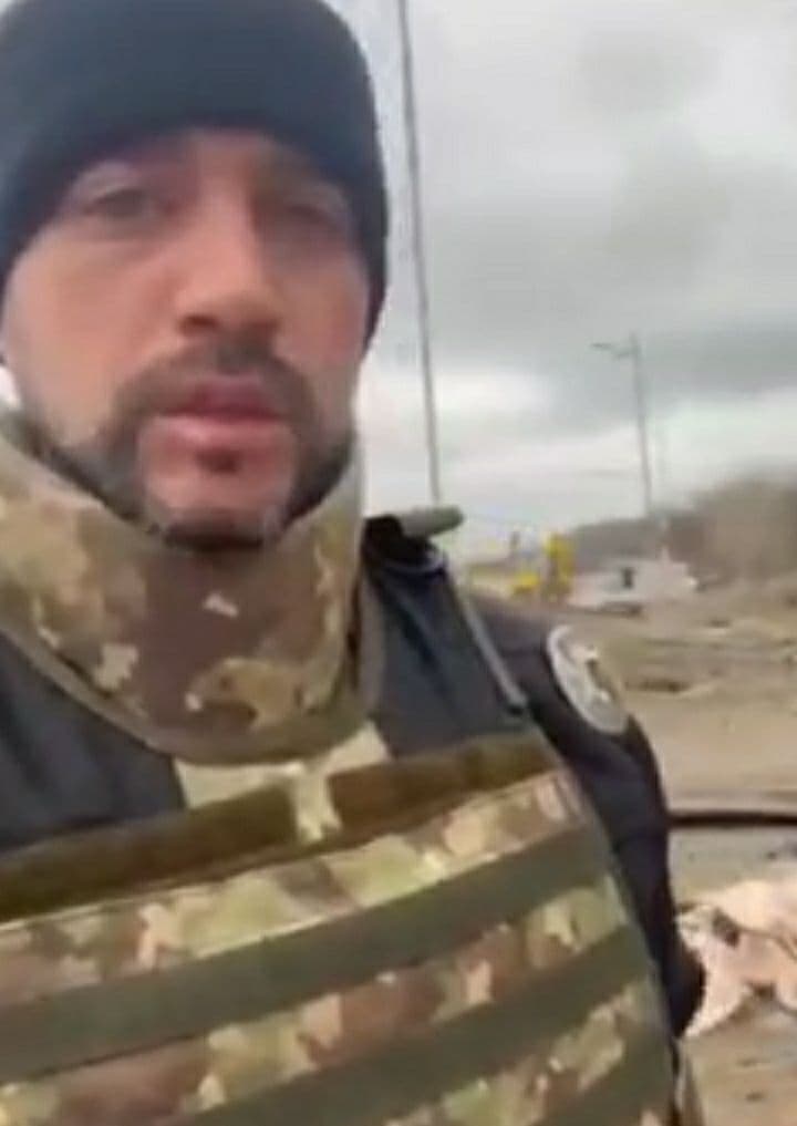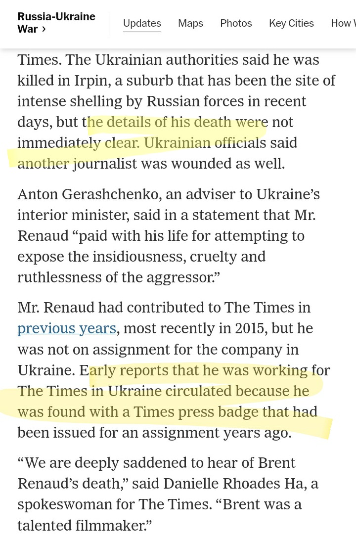 There's a graphic video of man who says in Ukrainian that journalist Brent Anthony Renaud was shot in Romanivka near Irpin, at the time under Ukrainian control. Based on his equipment, he looks like a Ukrainian cop who arrived on scene. 1/