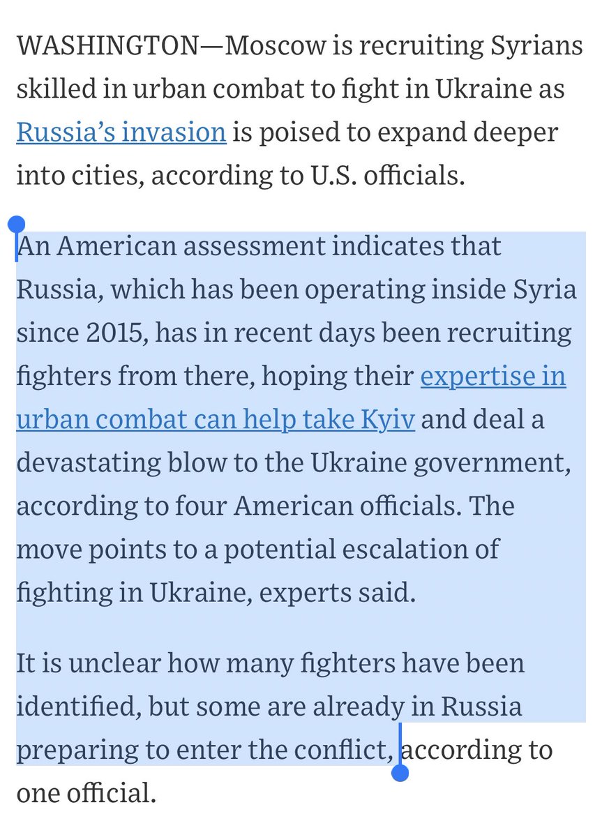 “Russia has in recent days been recruiting fighters hoping their expertise in urban combat can help take Kyiv & deal a devastating blow to the Ukraine government…It is unclear how many fighters have been identified, but some are already in Russia preparing to enter the conflict”