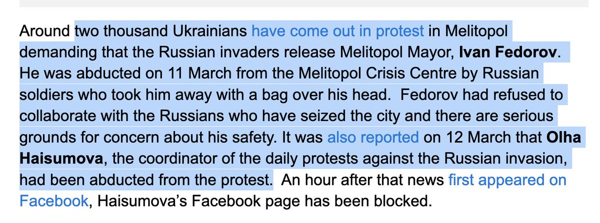 @halyapuff "Fedorov Is Our Mayor!"—2000 Ukrainians protested today demanding Russian invaders release #Melitopol Mayor, abducted y'day by Russian soldiers—who took him away with a bag over his head. Olha Haisumova, coordinator of daily Melitopol protests since invasion began, also abducted.