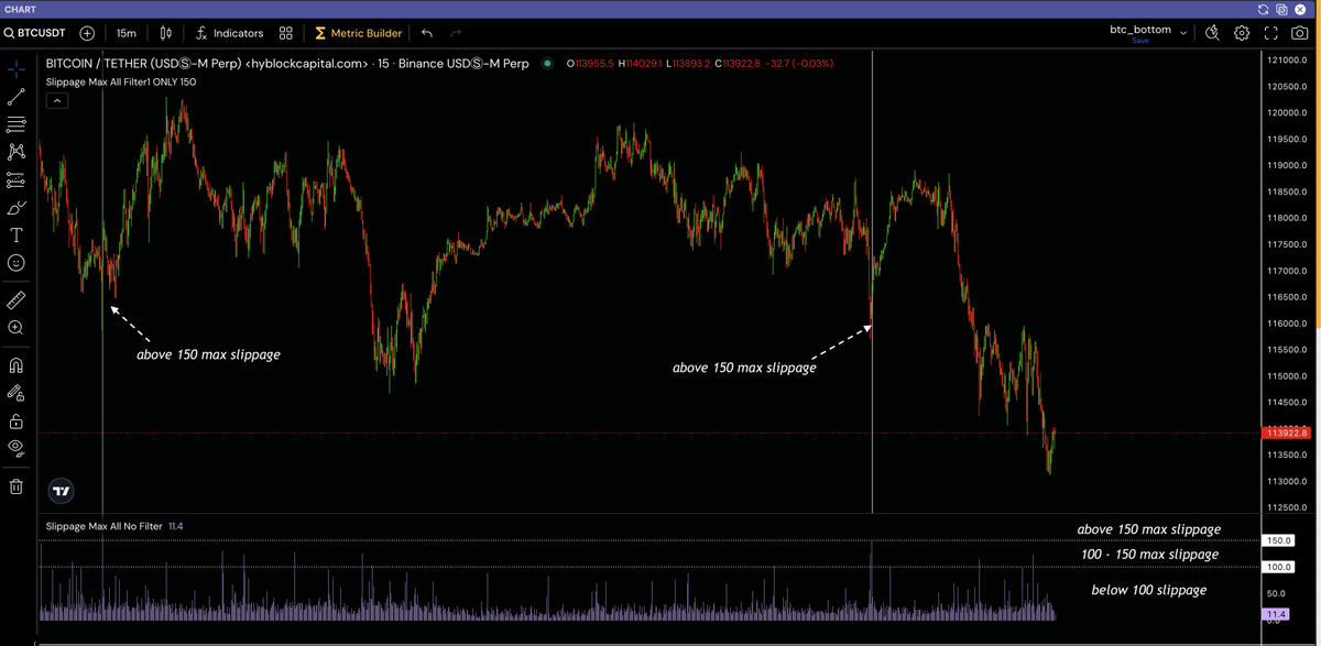 Chart is highlighted every time the max slippage >= 150 on 15m timeframe. And the second image is more zoomed in, to show it catching mini-bottoms.