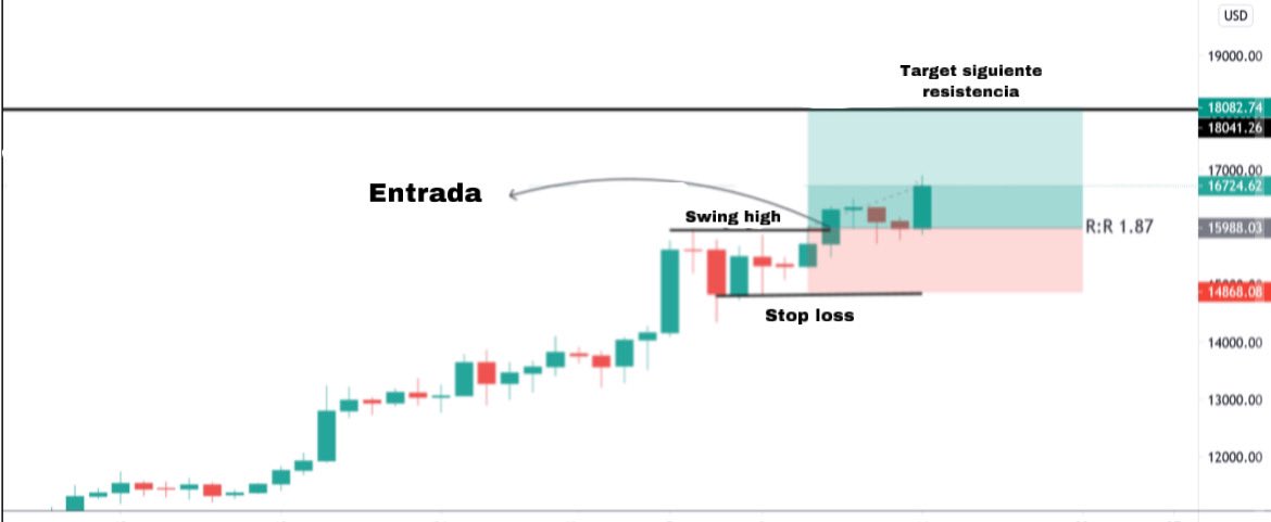 Por ejemplo: si el target está un 10% por encima de la entrada y el stop loss está un 5% por debajo de la entrada, el RR será 2:1.