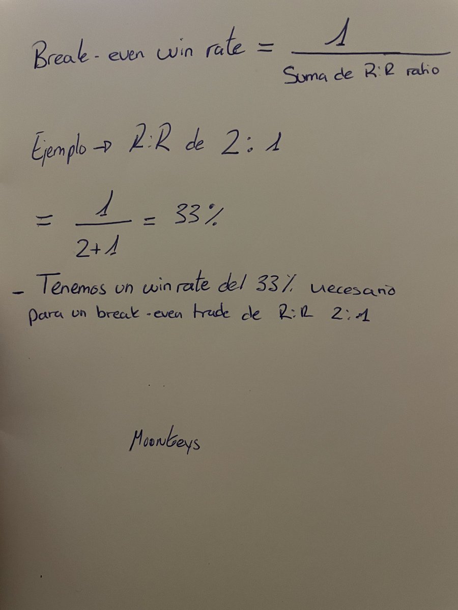 Por ejemplo: si tu tasa de ganancia es del 50%, estará en el punto de equilibrio en una relación R:R de 1.