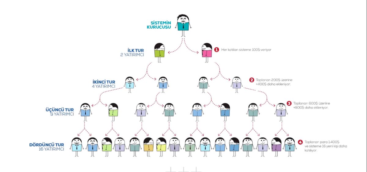 11-) Para yatırıp her 3 ayda parasını geri alan herkes daha çok para yatırıp daha çok kişiye bu yatırımı öneriyor sistem çığ gibi büyüyor. Sonradan gelenler aslında parasını önceden gelenlere veriyor değirmen böyle dönüyor.