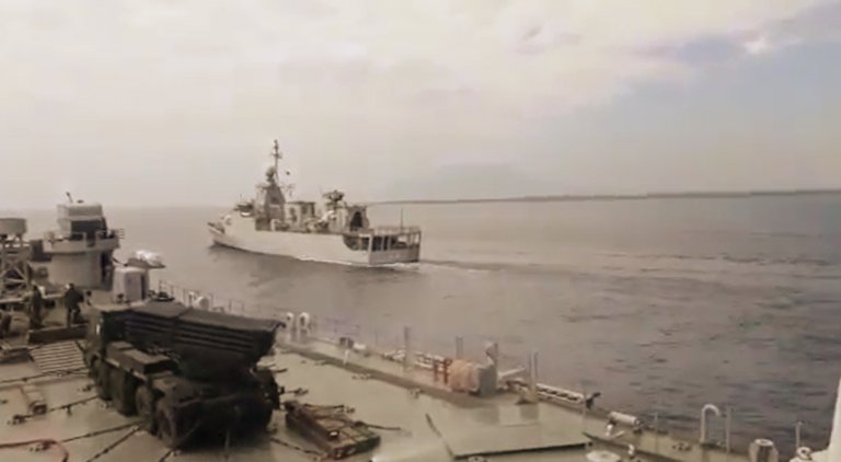 Severely damaging the warship as unguide MLRS rockets came down on the deck and superstructure. This was a brand new boat with a high tech air defence system taken out of action by land based unguided rocket artillery systems.