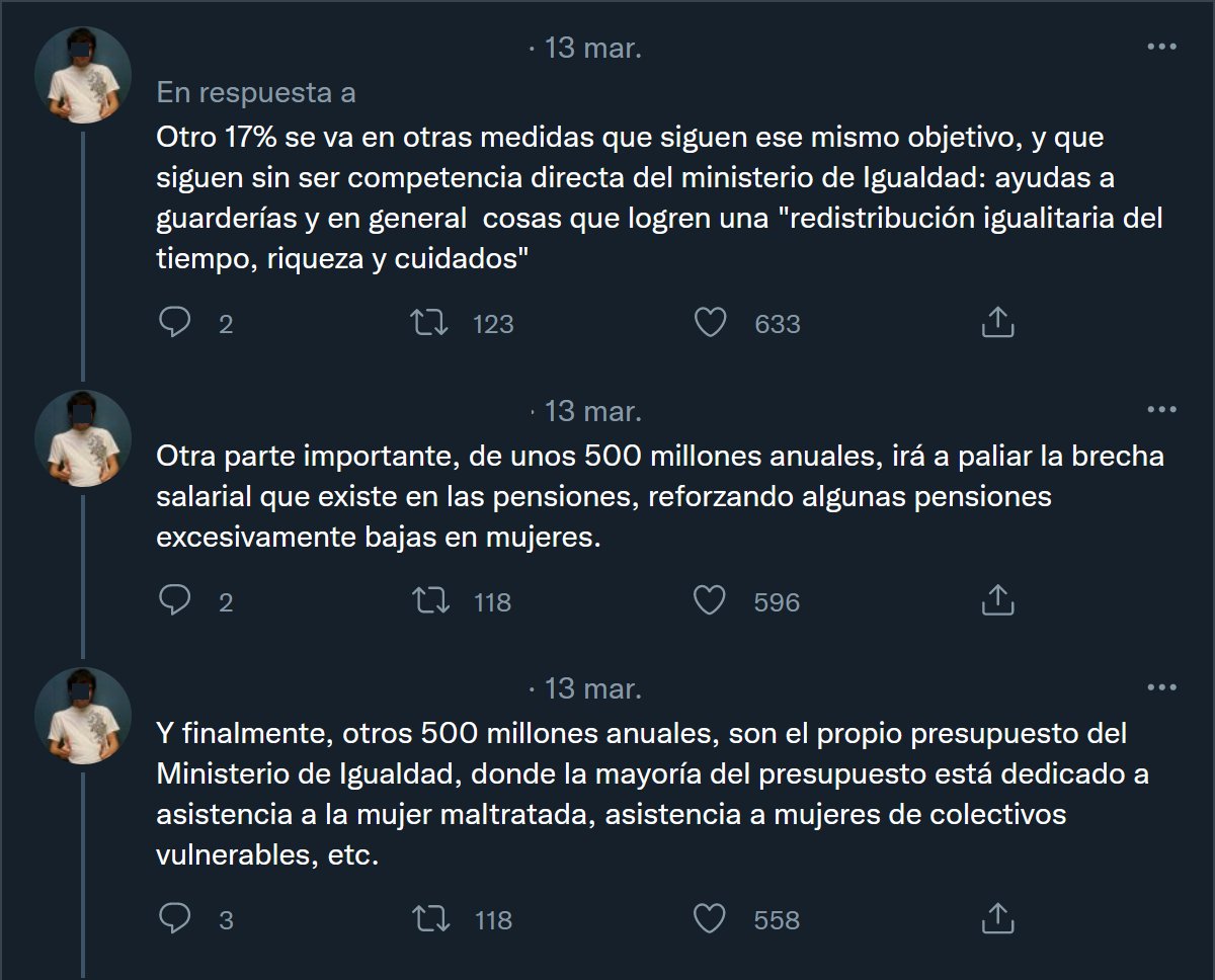 También afirma que otro 17% va hacia medidas para el mismo objetivo, que 500 millones van para atenuar la brecha salarial y otros 500 son el propio presupuesto del ministerio de igualdad.