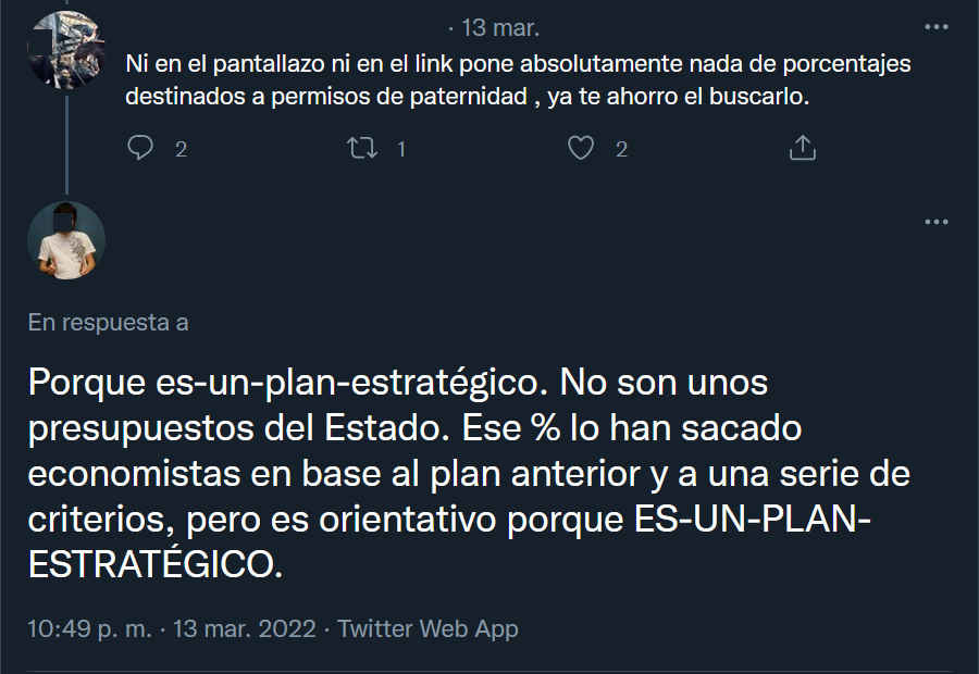 No obstante no pone ningún pantallazo al respecto y cuando le achacan que ese 70% en permisos de paternidad no figura en los informes, dice que lo ha sacado de unos supuestos economistas que se han basado en el plan anterior.