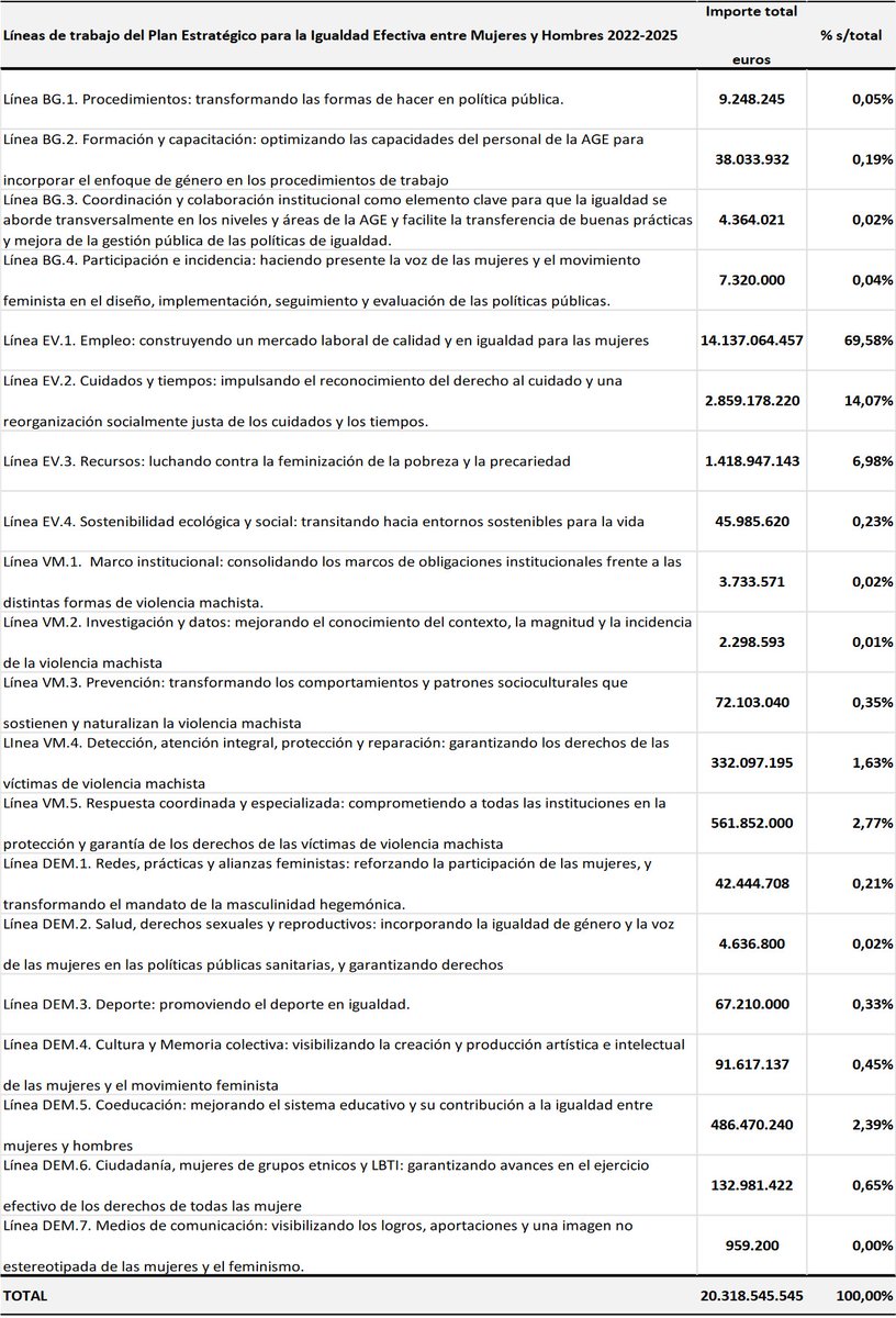 Por supuesto no hay ni rastro de dichos economistas 😁, y si miramos el plan, vemos que el grueso del presupuesto está destinado para la línea EV 1 que son más de 14.000 millones destinados a políticas de empleo para la mujer.
