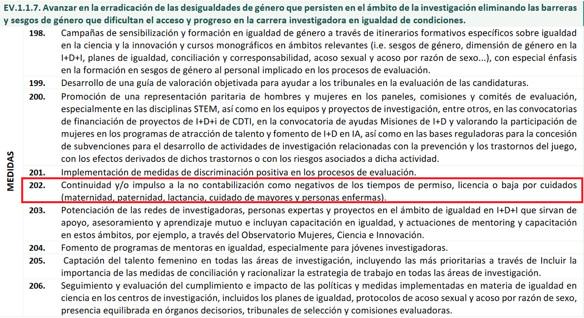 La única mención que hay en ese punto sobre bajas de paternidad es un pequeño punto dentro del apartado EV 1.1.7, que no hace referencia al entorno laboral, sino al de investigación académica, y no habla solo de bajas paternales, sino también maternales y cuidados a mayores.