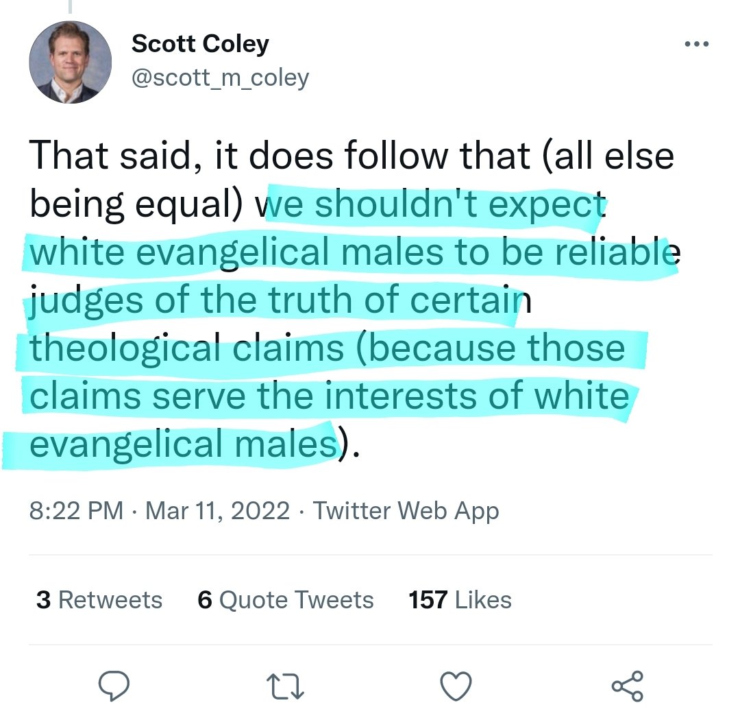 2.We can't expect White evangelical males to be good judges of theological claims in their self interest