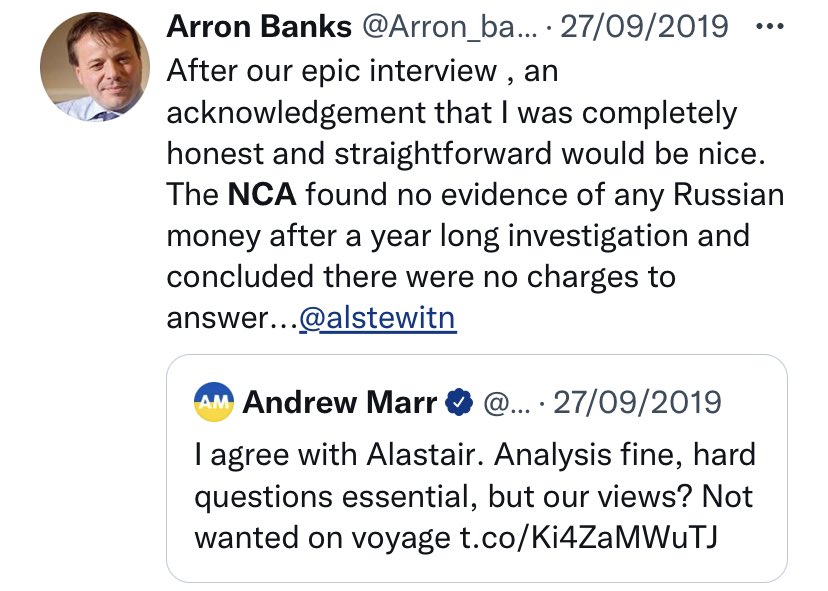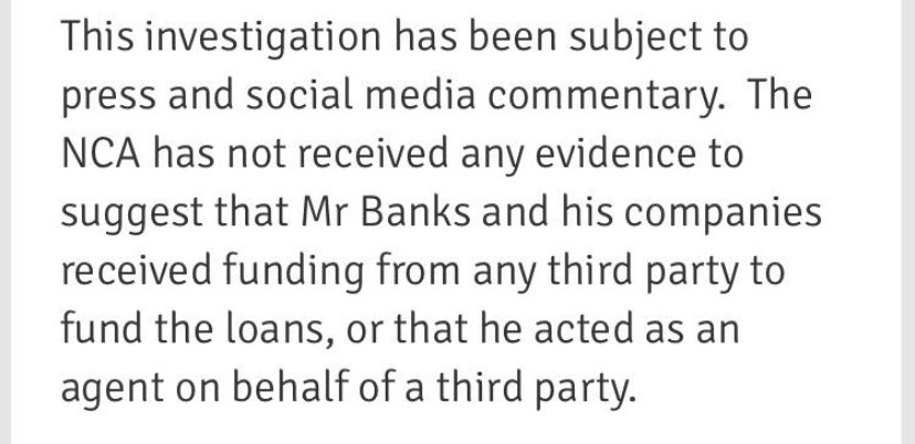 Banks is out tonight making usual threats, this time against @RhonddaBryant. His claims are, at best, imprecise. He says: ‘The NCA found no evidence of Russian money.’What NCA made clear is that it had not ‘received’ any evidence. It didn’t actually look.