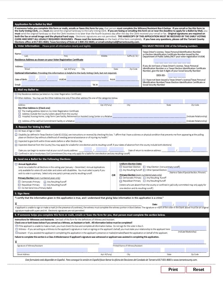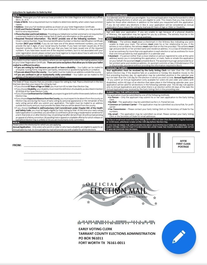 (2) The Texas Secretary of State created a model application; this model was followed by the other 9 counties on my list. Here is the Ballot By Mail application for Tarrant County ⤵️
