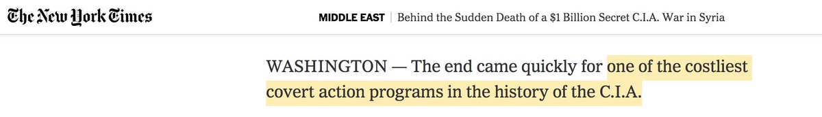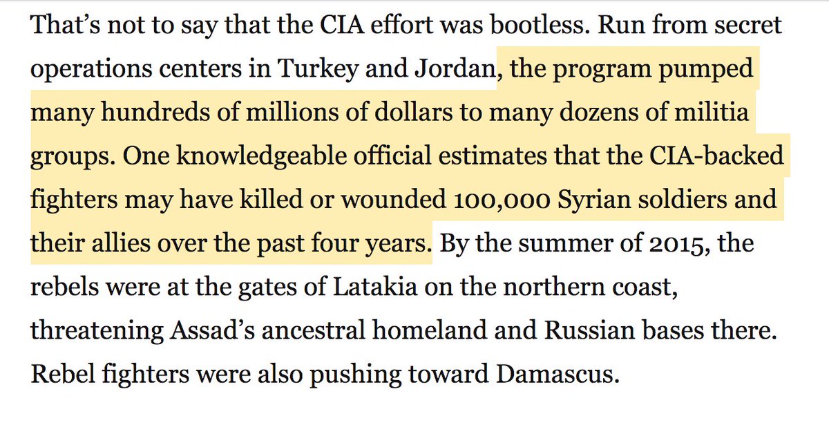 Luckily there are still US outlets that allow the inconvenient facts: that the dirty war in Syria was one of "one of the costliest covert action programs" in CIA history, w/ "a budget approaching $1 billion a year," helping to kill or wound 100,000 Syrian soldiers & allies.