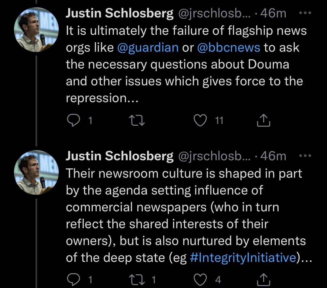 Unlike Justin, in my 13 year career, never once have I spread baseless conspiracies absolving a dictator of the crime of murdering children. He’s still squawking about “official narratives”. These people spread lies about a war crime. Period. There is no escaping from that.