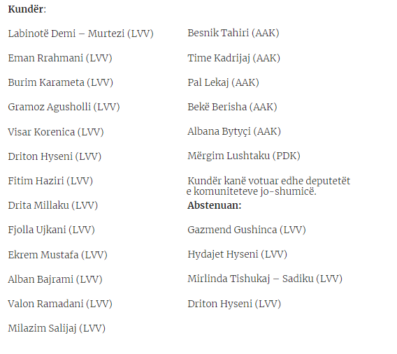 Lista e plote e deputeteve qe votuan pro dhe kunder