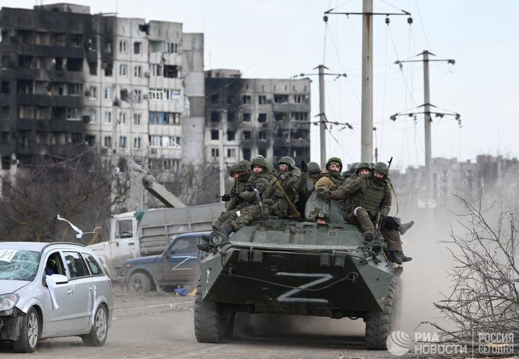 Soldati russi a Mariupol. Da notare i due veicoli civili dietro il blindato, con la "Z" delle truppe di invasione e poi l'auto civile con le strisce biance e un cartello sul parabrezza, crivellata di proiettili