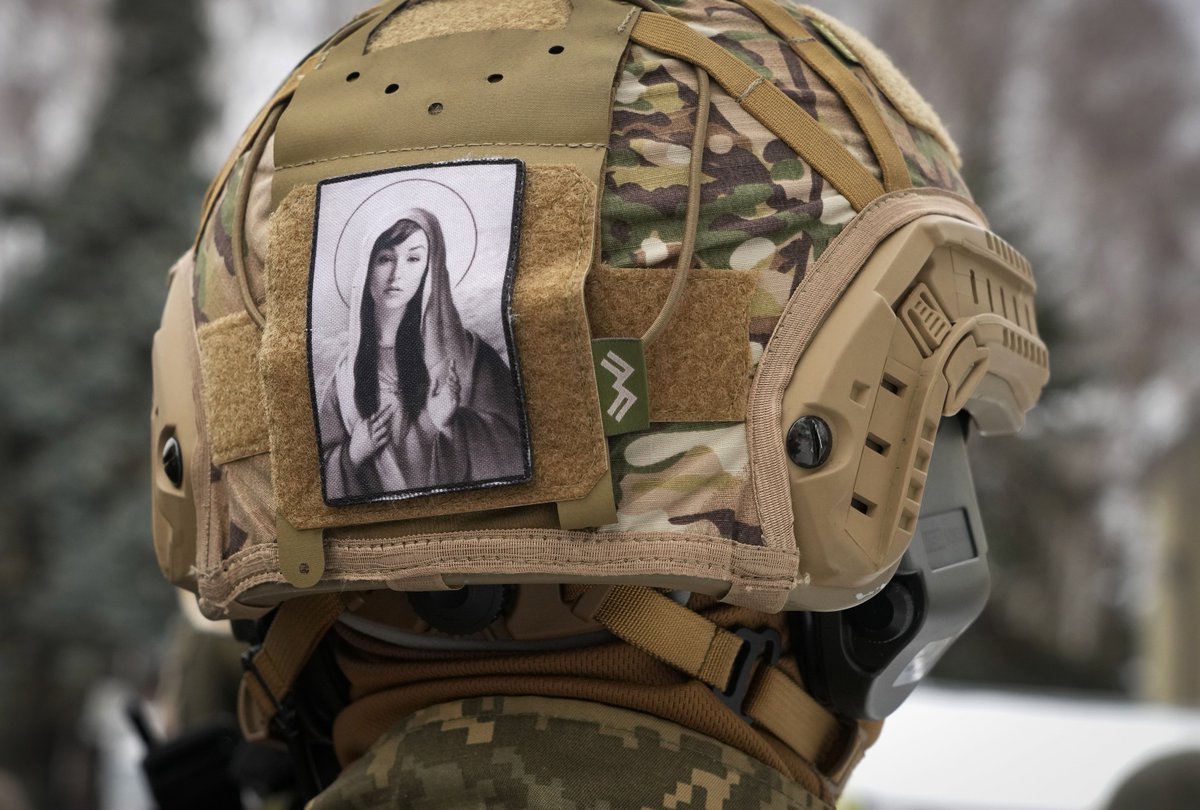Un soldato ucraino in un centro di addestramento con una foto dell'attrice Sasha Grey rappresentata come la Madonna sull'elmento (foto di Efrem Lukatsky per Ap)