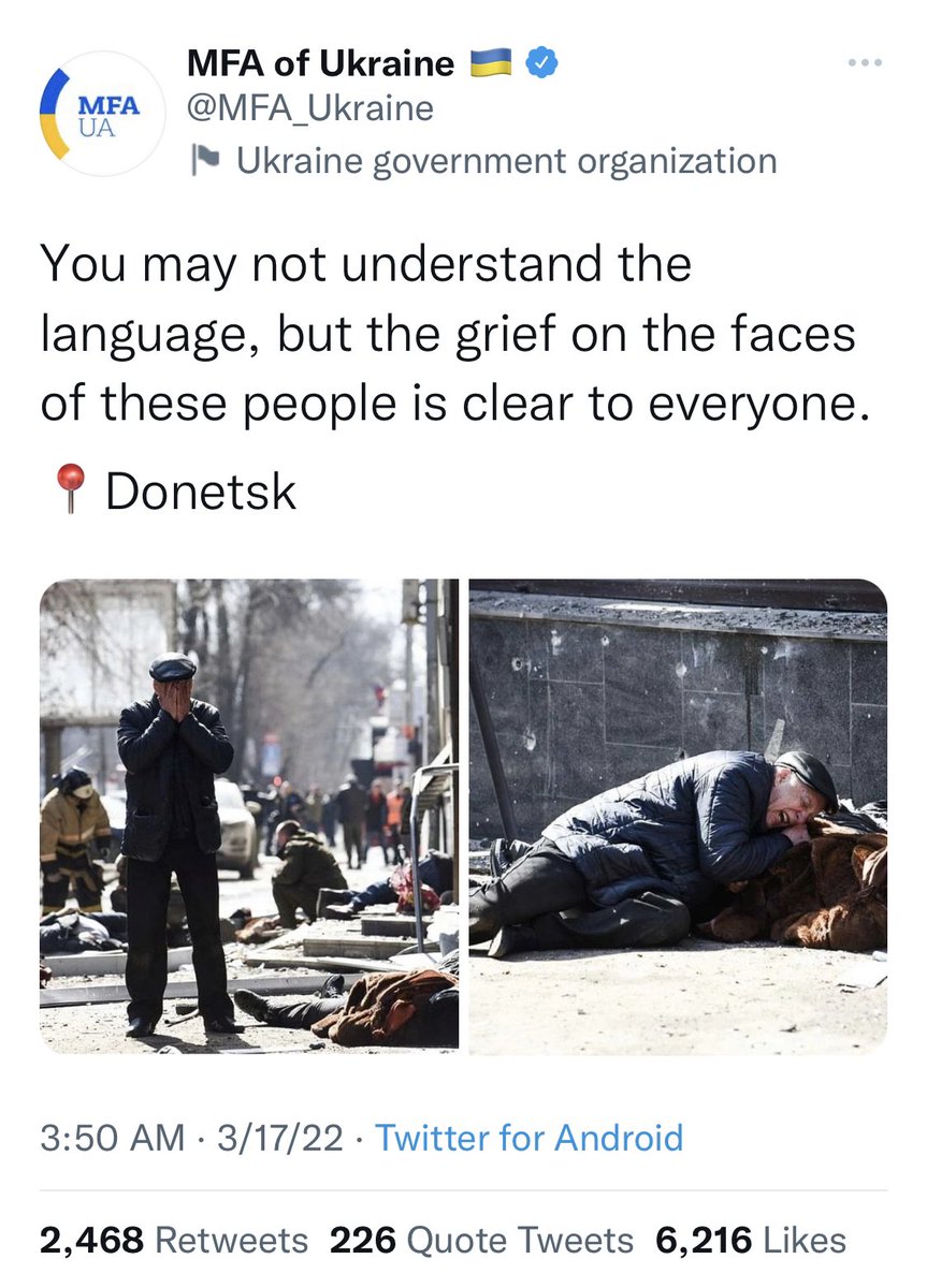La propia Ucrania está utilizando víctimas de sus ataques como si fueran de ataques rusos, como sucede en este tuit que adjunto. Apenas hay medios que se atrevan a desmentirlo.