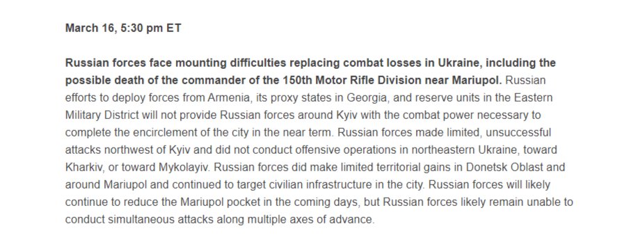 7/ Ma complessivamente, analisti, esperti e intelligence sono concordi nel dire che da almeno una settimana i russi si sono fermati per rifornirsi e rimpiazzare le perdite. Qui sotto un estratto dall'ultimo bollettino @TheStudyofWar