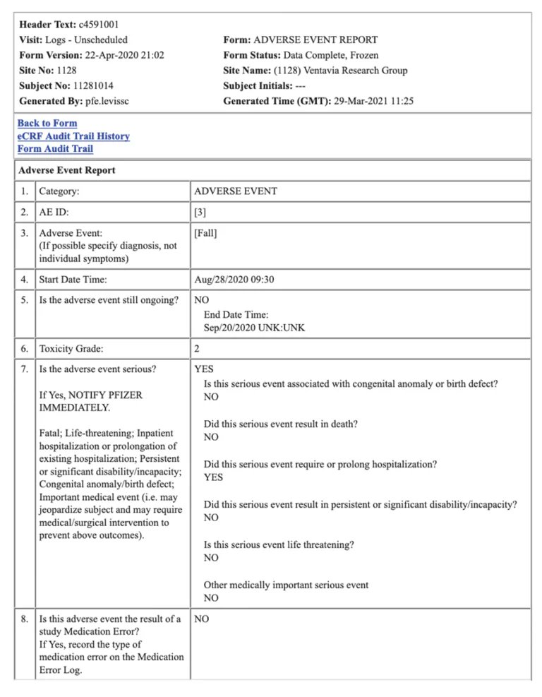 que este participante tuvo una caída grave, al día siguiente, 28 de agosto , después de que se le administró la segunda dosis, lo que resultó en su hospitalización. (Ver captura de pantalla a continuación)