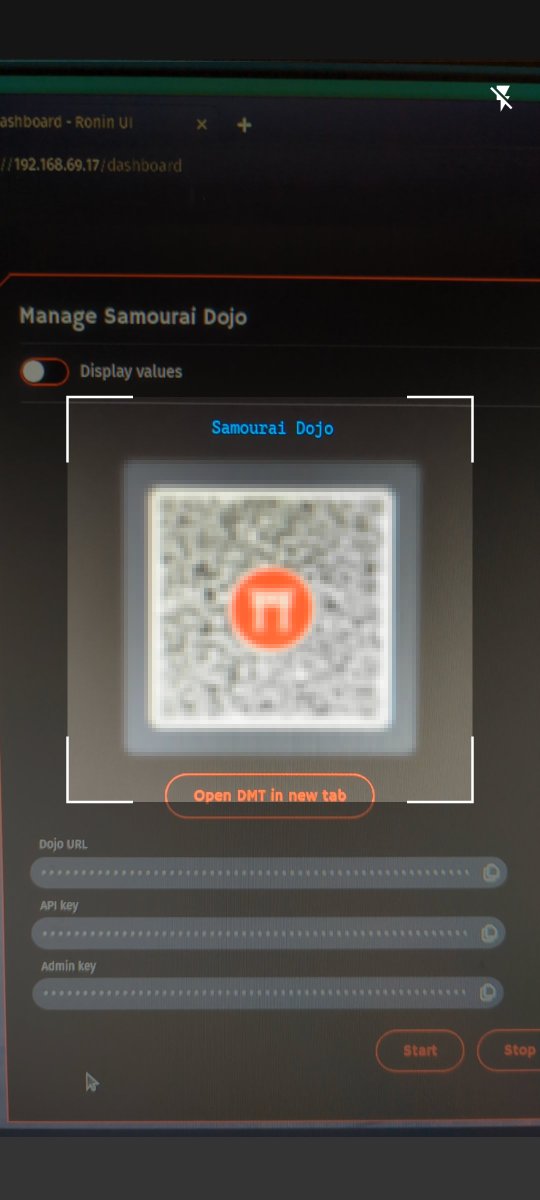 8/25 Once Indexer is at 100%, click on "manage" in the lower left-hand corner of the Dojo window, this will bring up the QR codes needed to connect @SamouraiWallet & @BitcoinExplorer. Toggle the "display values" switch to make them legible.