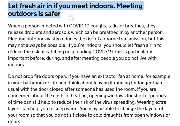 The current Government advice is clear—outside is safer than inside and is recommend for gatherings: further, barring that, good ventilation (which they describe as opening windows and doors) in order to reduce risk: