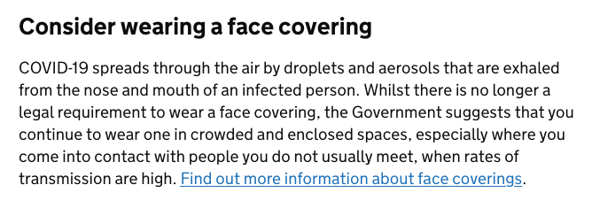 'the Government suggests that you continue to wear one in crowded and enclosed spaces, especially where you come into contact with people you do not usually meet, when rates of transmission are high'