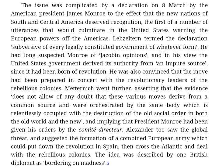 When the United States issued the Monroe Doctrine -- that it would resist any European efforts to intervene in the Western Hemisphere -- Metternich took it as evidence that it too was controlled by the great revolutionary conspiracy centered in Paris.