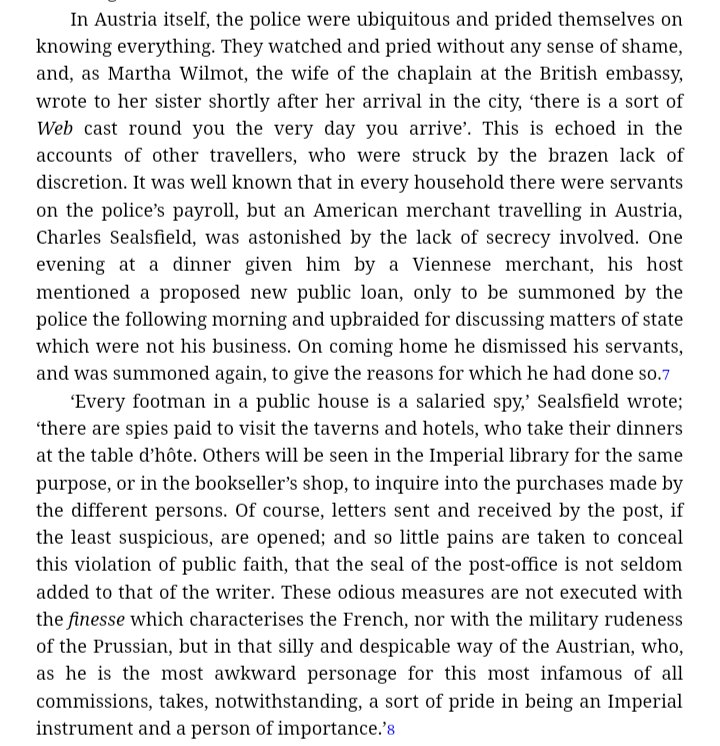 The Austrian secret police made few efforts to conceal themselves. When an American merchant discussed politics over dinner, he was brought in for questioning the next day. Knowing his servants were informants, he dismissed them, only to be hauled in for that as well.