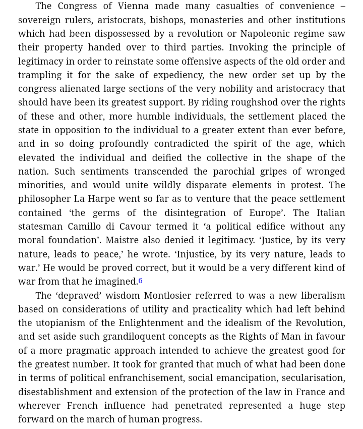 The Congress of Vienna couldn't go all the way back to the ancien régime, and instead enshrined a sort of utilitarianism, justifying European governments on the grounds of the benefits they gave their subjects. This left many, on the left and the right, deeply unsatisfied.