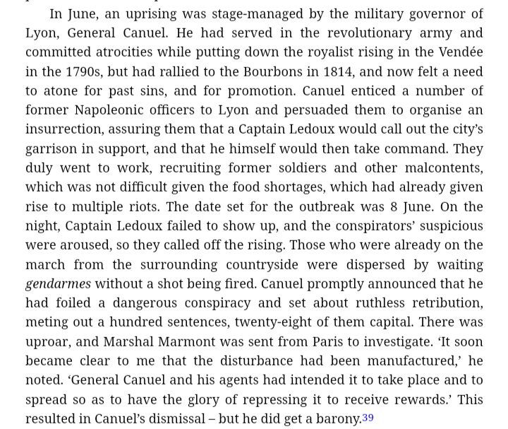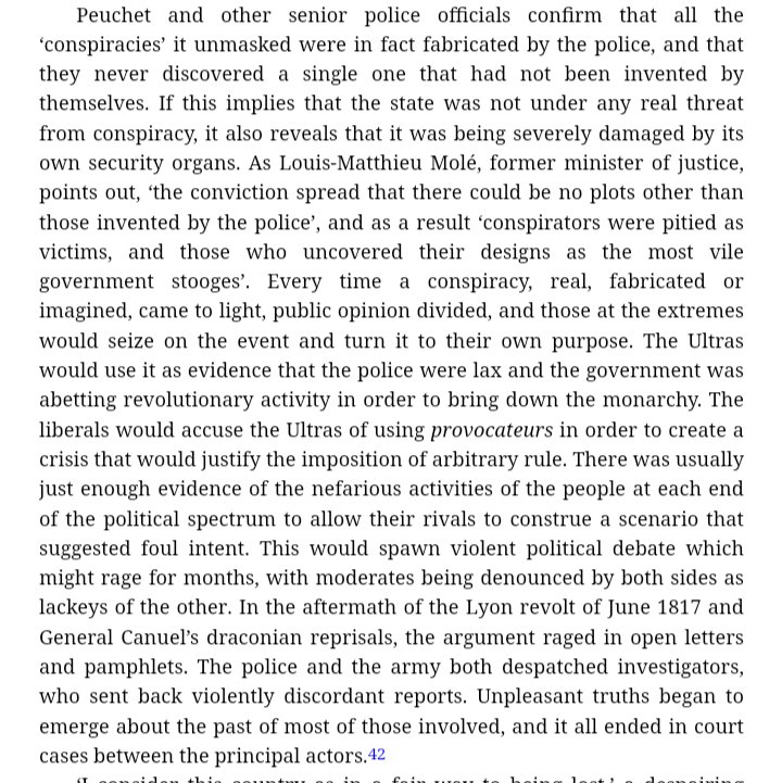 "Most if not all of the 'conspiracies' the police uncovered during this period were of its own creation." Agents got Napoleonic veterans drunk, encouraged them to denounce the king, and then arrested them; one general masterminded an insurrection, crushed it, and got a barony.